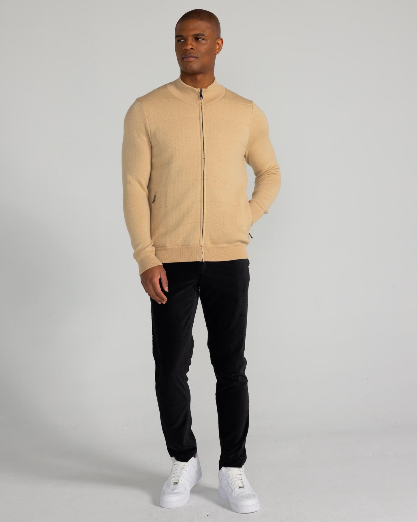 The Cliff Jacket is our classic yet luxurious wool jacket in a contemporary cut with front zip detail and two functional front pockets. Its eco-friendly natural fiber is proven to keep moisture away. Finished with a striped and rib knit cuff and waistband. Redvanly ‘r’ branding featured on the left arm.